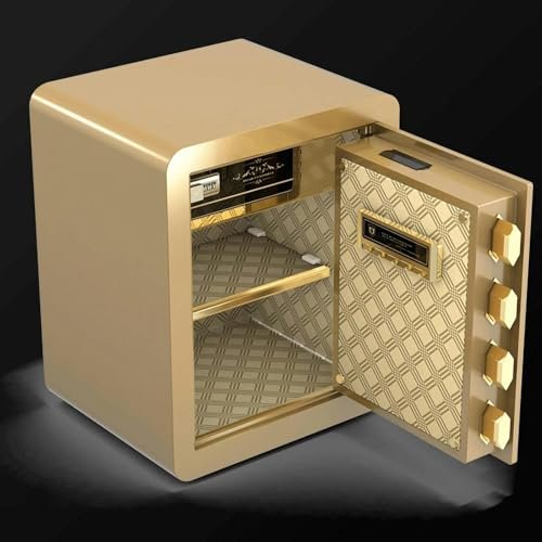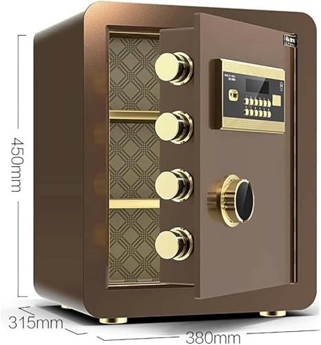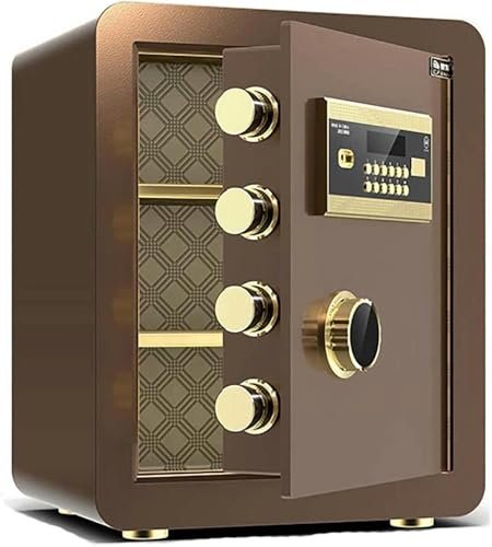 Easily secure cash and valuables with this biometric home safe. Features quick fingerprint access, digital keypad backup, dual alarm, removable shelf, and a fireproof/waterproof bag—sleek brown design fits any room.