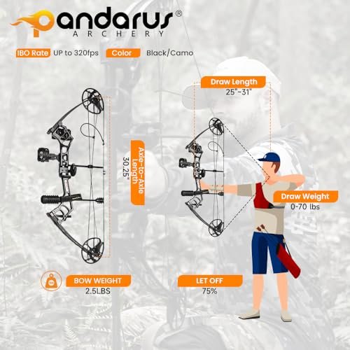Dominate the hunt with the PANDARUS Archery Compound Bow – precision-engineered for adult and teen archers. Adjustable 25″-31″ draw, 0-70 lbs draw weight, blazing 320 fps speed. Lightweight, USA-made, ready to deliver accuracy and power.
