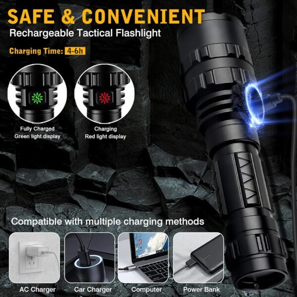 Imagine having a beam so powerful it can illuminate your entire campsite or tactical environment with crystal-clear clarity. This tactical flashlight delivers an incredible 3000 lumens of pure, intense light that cuts through darkness like a knife. The integrated Picatinny rail mount makes it incredibly versatile, allowing seamless attachment to rifles, helmets, and other tactical gear.