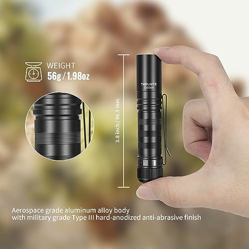 ThruNite keeps the Saber slim and balanced. It sits comfortably in jeans or a jacket pocket without printing, and the knurled grip prevents slips when wet or when you’re wearing gloves.