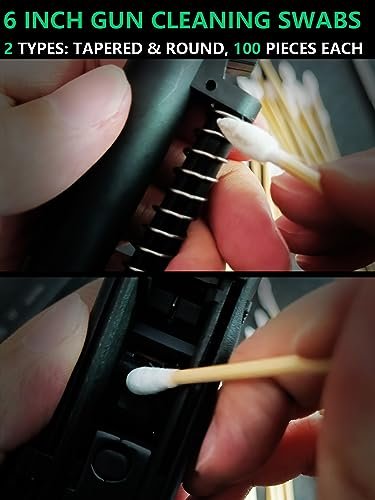 – 200 pcs 6″ gun cleaning swabs (long-reach for tight areas)